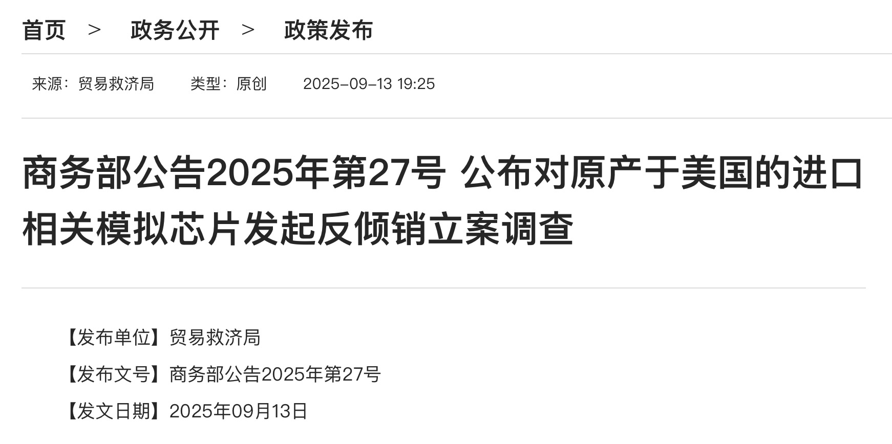 官网显示,商务部新闻发言人就对原产于美国的进口相关模拟芯片发起反倾销调查答记者问。