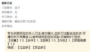 轮回后将血影刀法修炼至400级,可获得门派绝学,此绝学前期堪称最强,威力非凡。