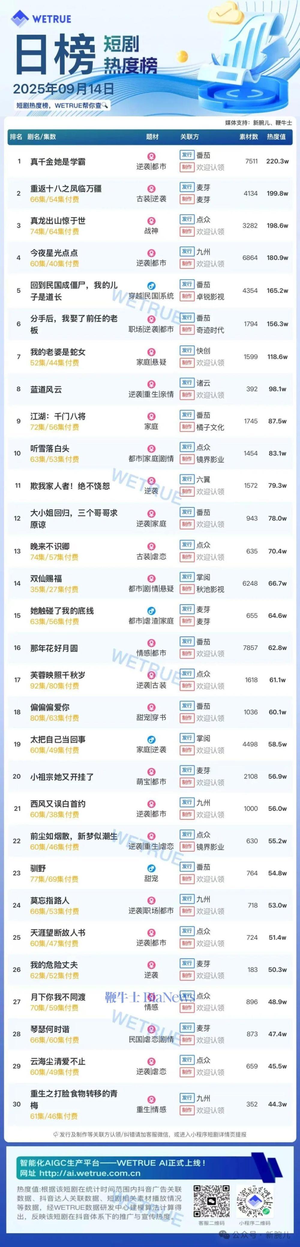 1、本日榜为WETRUE短剧数据公司提供,新腕儿和鞭牛士提供联合支持。