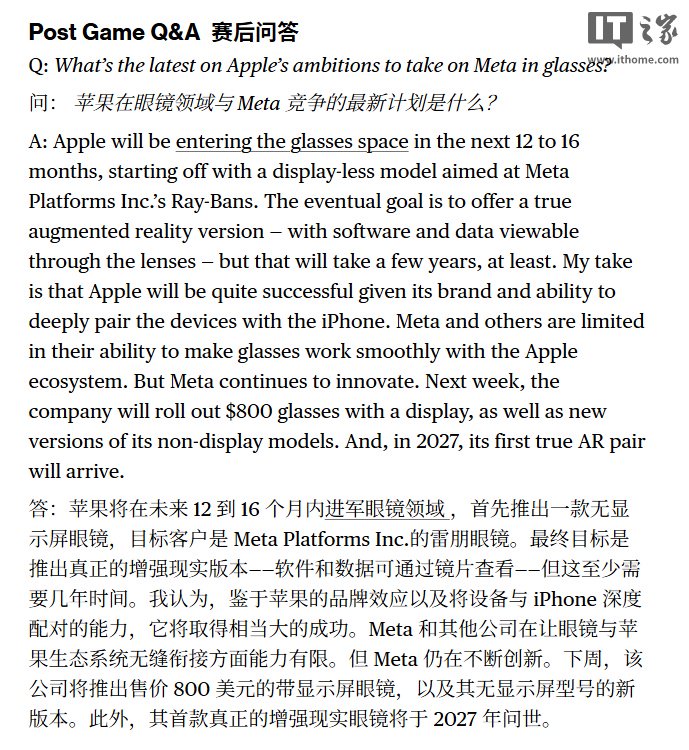 IT之家注意到,古尔曼进一步指出,苹果推出的首款智能眼镜将是无显示屏版本,其定位是与 Meta 的 Ray-Bans(雷朋)智能眼镜展开竞争。这意味着该款产品将配备摄像头、具备播放与录音功能的音频系统,并需连接 iPhone 以实现数据处理。