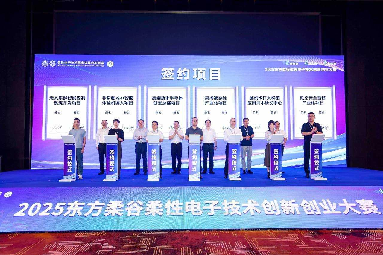 9月13日,由嘉兴市人民政府、嘉兴市科学技术局、柔性电子技术国家级重点实验室、浙江清华柔性电子技术研究院等单位联合举办的2025“东方柔谷”柔性电子技术创新创业大赛在浙江嘉兴隆重开幕。开幕式成功举行了嘉兴市科技成果转化中心的授牌和柔性电子产业培育基金的成立仪式,同时一批柔电产业项目也在本次开幕式上进行现场签约。