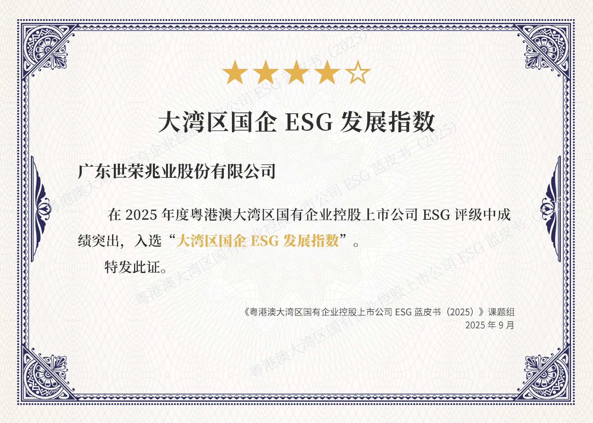 9月5日,“第五届国企社会价值论坛暨ESG中国・粤港澳大湾区企业社会责任发布会”在深圳隆重举行。本次论坛由中国企业改革与发展研究会、责任云研究院主办,广东省国资委、华润集团联合主办,汇聚了粤港澳大湾区众多优秀企业共话ESG发展与社会责任担当。会上,世荣兆业凭借在环境、社会及治理领域的稳健表现,成功入选“大湾区国企ESG发展指数”前30强,其《深耕湾区发展 赋能区域新篇》ESG社会责任实践案例同时被选入《粤港澳大湾区国有企业控股上市公司环境、社会及治理(ESG)蓝皮书》与《珠海市国资国企社会价值暨ESG蓝皮书》,成为区域国企ESG实践的标杆企业。