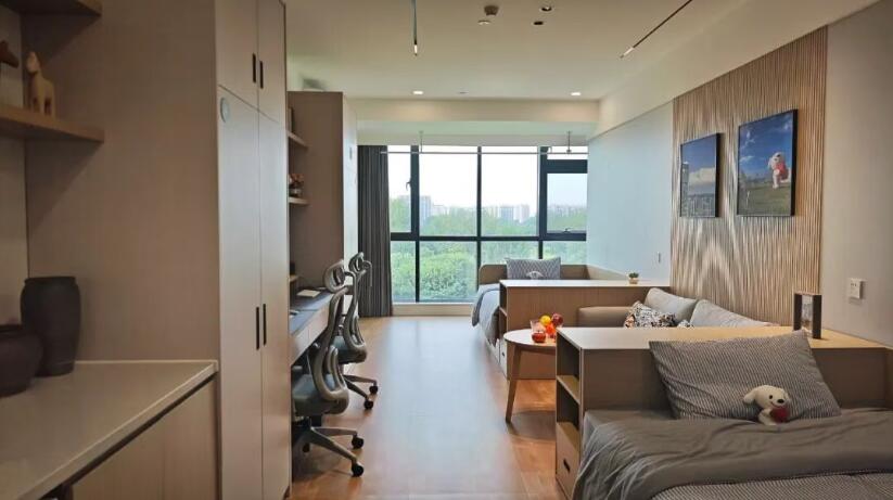 实习生公寓主打“舒心、省心、安心”的概念,目的是让来自全国各地的实习生同学感受“家的温度”。公寓里人脸识别闸机入楼、固定楼层电梯梯控、智能密码锁进门,走进房间,从工作、学习所需的人体工学椅、书桌,到起居所需的干湿分离的卫生间、洗衣机,家电家具一应俱全。公寓的公共空间里,配备了开放式厨房、共享洗衣房等。与此同时,24小时安保及定期巡查、随时在线的专属管家,也让同学们倍感安心。