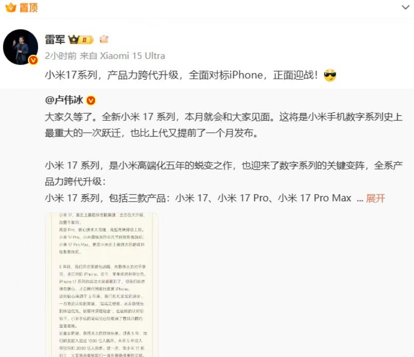 随后,小米创始人、董事长兼CEO雷军转发该微博,并表示:“小米17系列,产品力跨代升级,全面对标iPhone,正面迎战!”