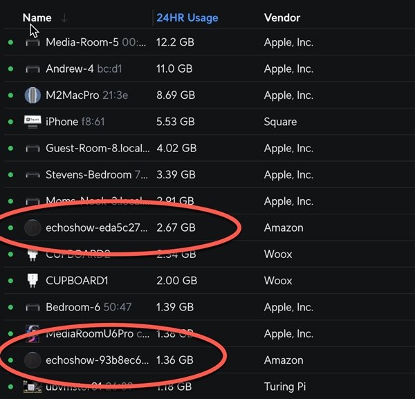 他分享的图片显示,他的两台亚马逊Echo Show设备在24小时内消耗了超过4GB的数据,Echo Show是一款带有触摸屏界面的智能音箱,可作为智能家居的中枢。