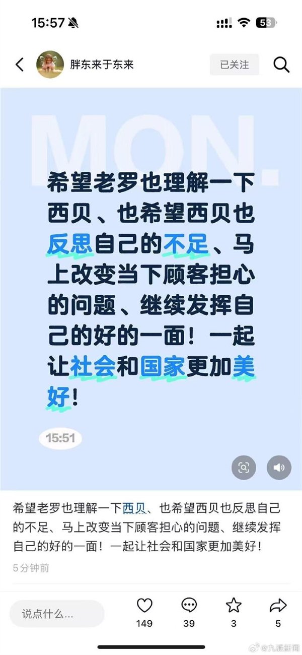 对此于东来在发文:“希望老罗也理解一下西贝、也希望西贝也反思自己的不足、马上改变当下顾客担心的问题、继续发挥自己的好的一面,一起让社会和国家更加美好!”
