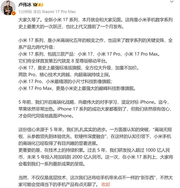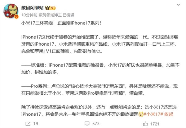 紧随卢伟冰发布微博之后,微博博主数码闲聊站也发博表示小米17系列提档一口气上三杯硬刚苹果,内部很有信心。标准版将会加量不加价,Pro系列会带来“核心大突破”和“新东西”,甚至可以让苹果的Pro系列变成“过程稿”。