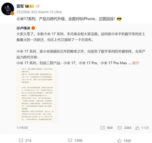 9月15日消息,小米集团合伙人、总裁卢伟冰今日发博,官宣了小米17系列发布时间就在本月。