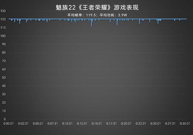 《王者荣耀》高画质+120帧,平均帧率高达119.5帧,平均功耗3.9w,无论是对线还是团战,都能保持“丝滑”。