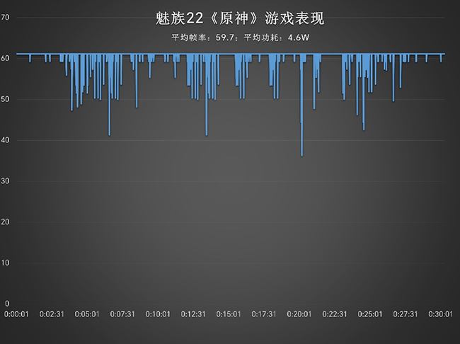《原神》开启高画质+手动60帧,平均帧率59.7帧,平均功耗4.6w,能效比为12.6FPS/W。
