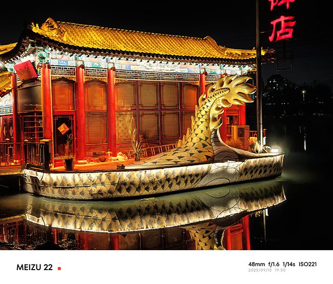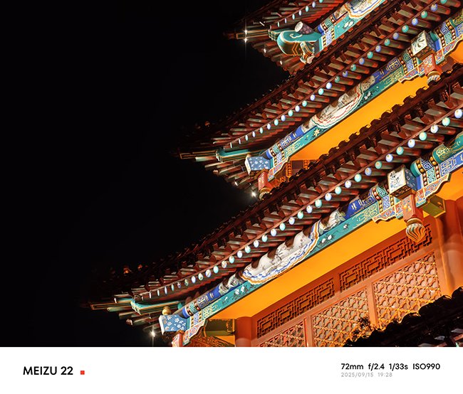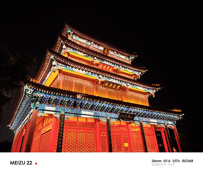 夜景方面,得益于7P镜片以及OIS+EIS双防抖,进光量和成片率大幅提升,样张炫光抑制的出色,魅族22在夜景上有着鲜明的个性,高光的压制也很好,但暗部细节稍有涂抹。