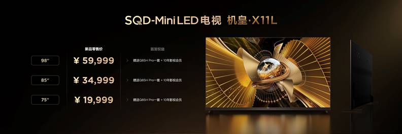 技术颠覆性升级,价格依然给力,TCL X11L 98/85/75吋零售价分别为59999元、34999元、19999元,TCL的顶尖科技,让所有用户都能触手可及。