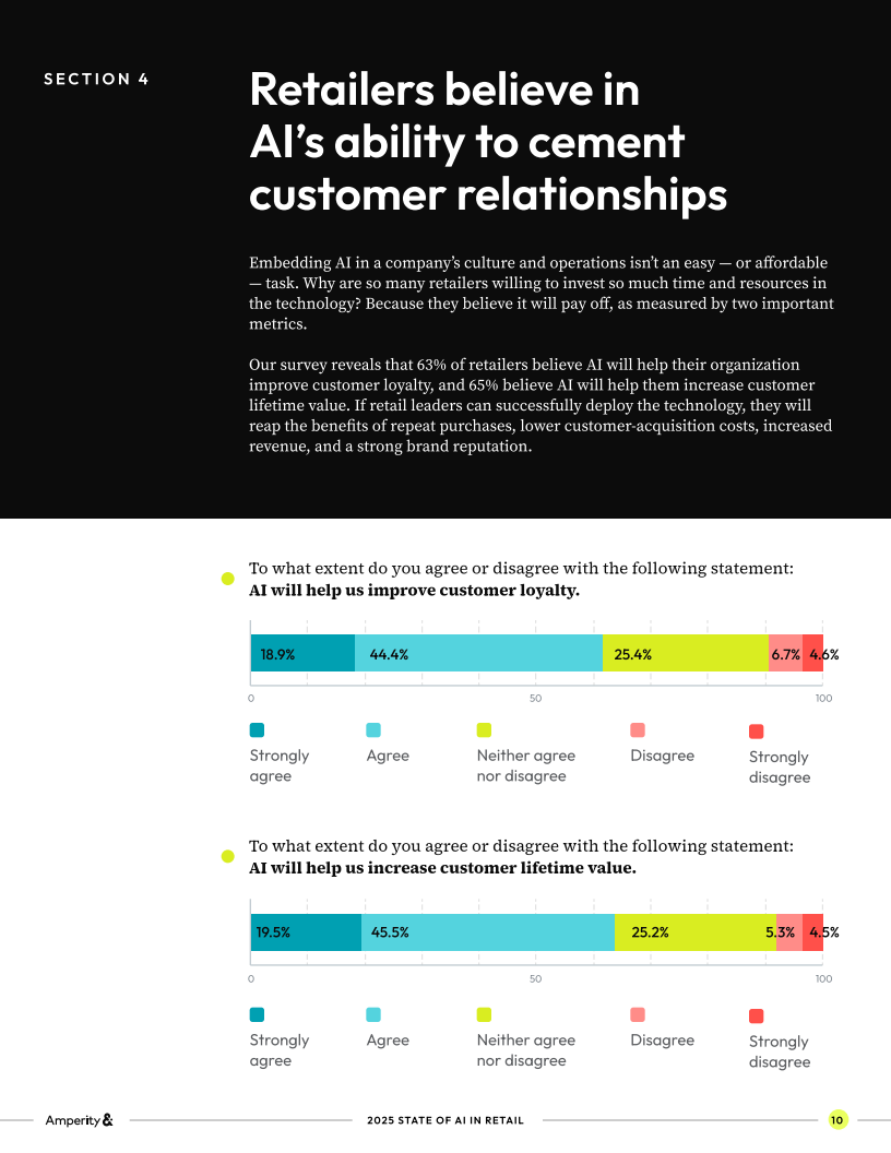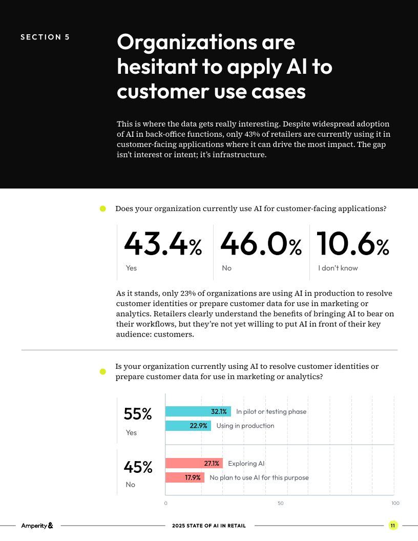 然而,客户触点上的AI仍显迟缓。虽然63%的企业认为AI有助于提升客户忠诚度,65%看好其提升客户终生价值,但目前真正使用AI进行客户交互的只有43%。更尖锐的短板体现在“身份识别”:只有23%的零售商在生产环境中利用AI进行客户身份解析或数据准备,而这恰恰是所有个性化营销和预测分析的前提。零售商更倾向优先投资预测分析(36.7%)、客户细分(33.7%)和智能客服(32.9%),而身份解析仅获优先级的20%。