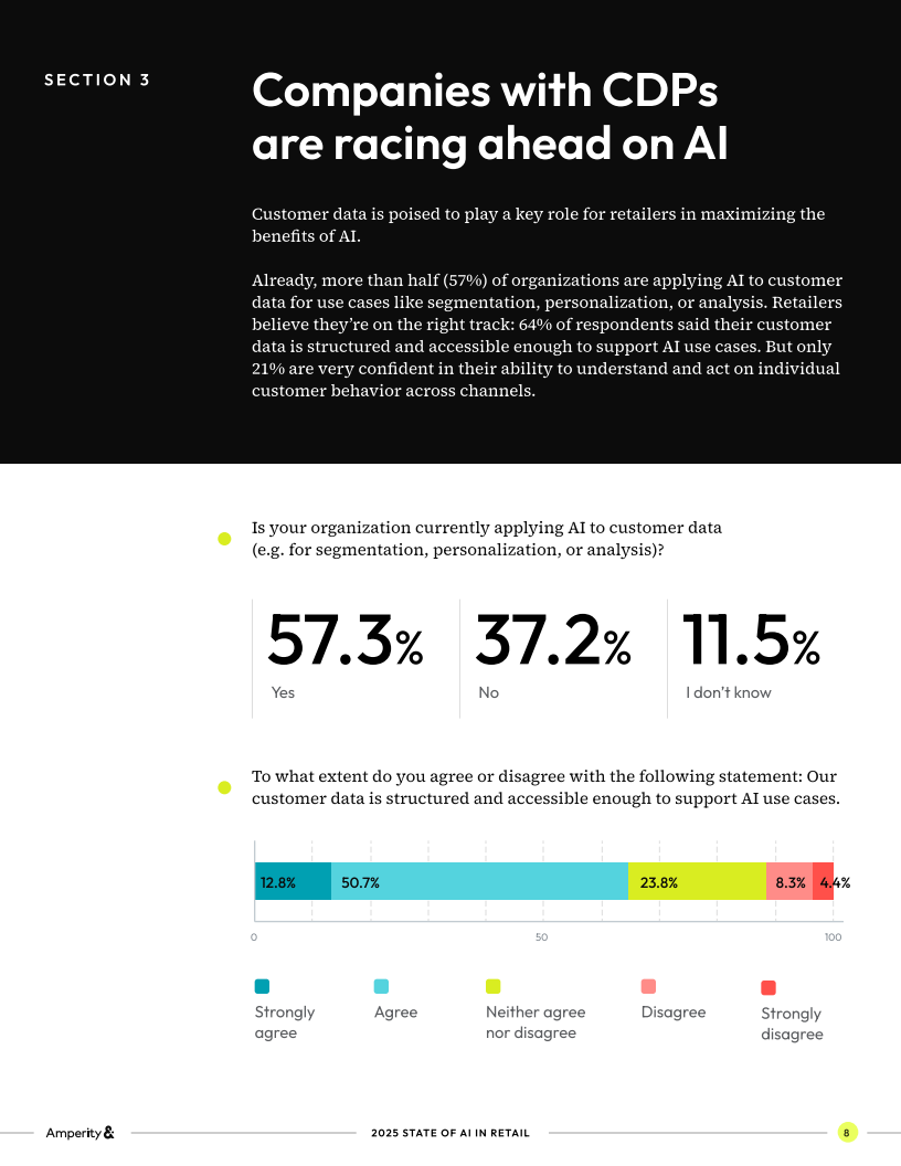 数据基础成为分水岭。超六成企业(64%)认为其客户数据已结构化、可支持AI应用,但只有21%表示非常有信心理解并行动于客户行为。采用客户数据平台(CDP)的企业明显领先:他们每日或每周使用AI的比例为60%,是未使用CDP企业的两倍;在多个业务单元全面落地AI的比例也是后者的两倍以上(22%对10%)。更关键的是,62%的CDP用户已将AI应用到客户交互环节,而无CDP的企业仅为22%。