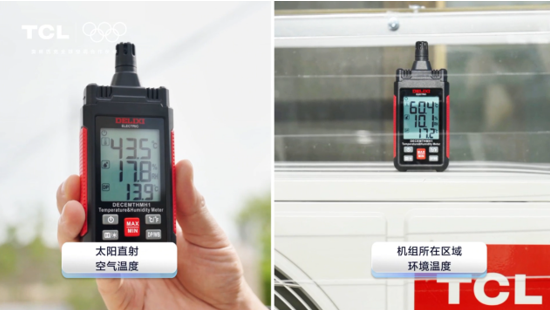 数据显示,太阳直射处空气温度达到43.5℃,机组附近环境温度更是高达60.4℃。即便如此,TCL小蓝翼C7新风空调仍可在测试人员的语音指令下,实现迅速响应,平稳启动,快速制冷,展现出应对极端高温的优异性能。