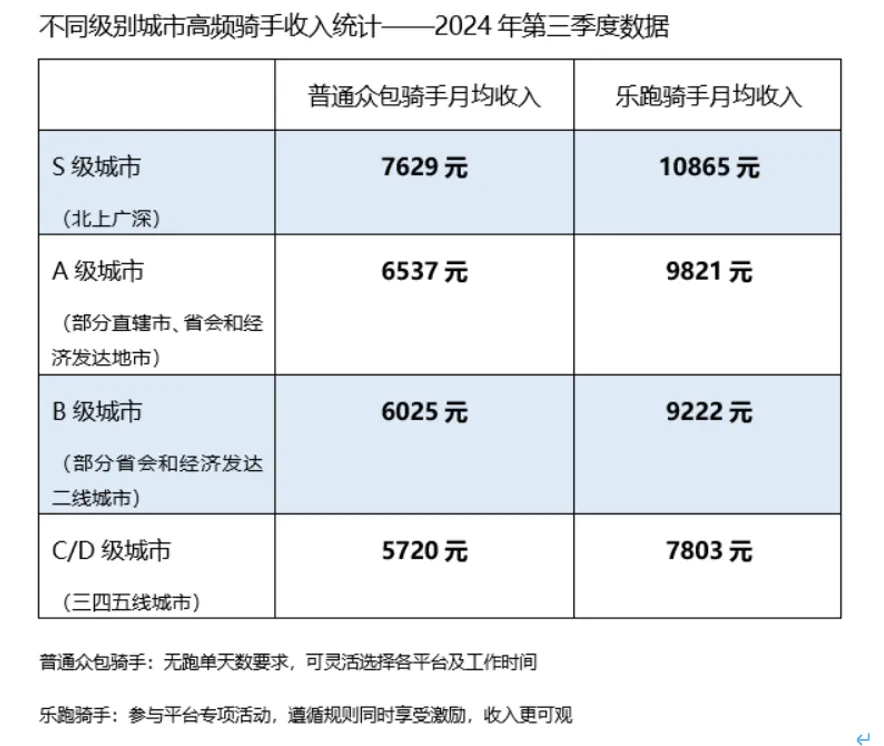 在北上广深等高线城市,高频骑手的月均收入为 7629 元至 10865 元。收入区间差异主要源自跑单类型的差异,例如普通众包骑手没有跑单天数要求,工作时间更自由,能自主、灵活选择各企业及平台的相关工作;而乐跑等参与平台专项活动的骑手,有各类激励和相应规则,获取的收入也更为可观。