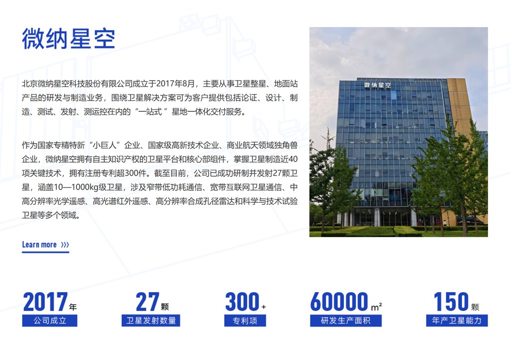 北京微纳星空科技股份有限公司成立于2017年8月,主要从事卫星整星、地面站产品的研发与制造业务,围绕卫星解决方案可为客户提供包括论证、设计、制造、测试、发射、测运控在内的“一站式 ”星地一体化交付服务。