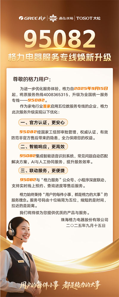 9月15日,格力电器正式宣布,全国统一售后服务专线全面升级为“95082”。该号码将作为格力官方唯一客服专线,面向全国用户提供更加高效、便捷、智能的售后服务支持。