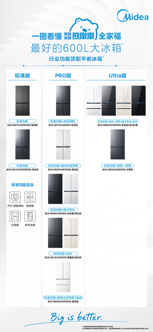 在 “定制化” 渐成消费主流的今天,美的熊墩墩冰箱更进一步,首创阶梯式功能配置叠加模式,以三大版本精准匹配不同家庭的个性化保鲜需求: