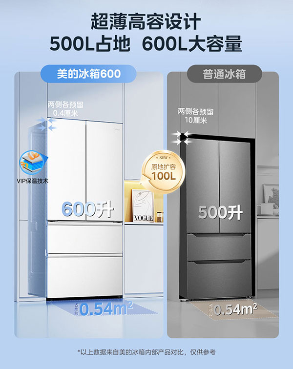 正是这三大技术合力,让美的冰箱熊墩墩以500L占地实现600L +超大容量,真正让 “小户型也能拥有大冰箱” 照进现实。不仅如此,其纯平全嵌设计凭借600mm 整机深度与正面900mm预留宽度的精准匹配,完美契合市面大多数精装厨房的预留尺寸,从根源上解决了嵌入式冰箱因留缝过大影响美观的行业痛点。