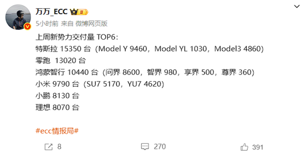 鸿蒙智行为10440辆,组合之后要比小米多,不过单论问界(8600辆),则要少于小米,排在新势力第三名。