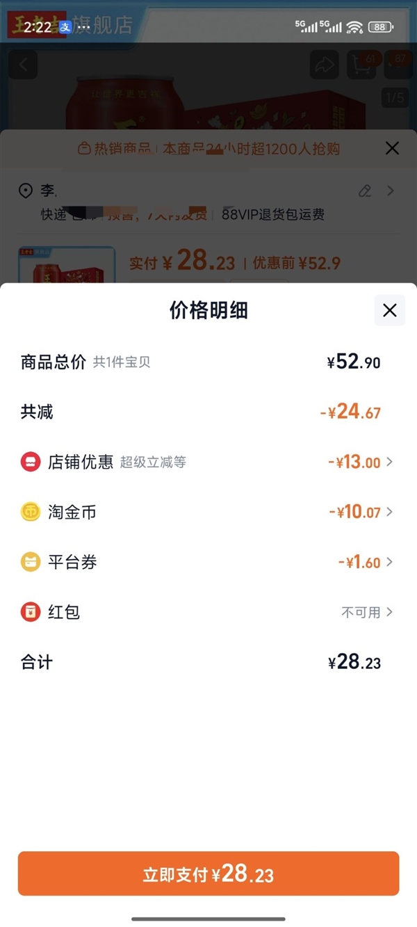 叠加淘金币10.07元优惠,店铺优惠5元和平台券1.6元,实付到手价28.23元,约合1.76元/罐。线下商超日常售价4元。