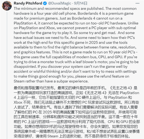 他提到《无主之地4》的系统要求极高,推荐至少配备RTX 3080显卡才能获得最佳体验,他还建议那些配置不足的玩家考虑在Steam上申请退款。