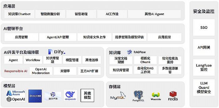 该平台构建在Dify、Langfuse、RAGFlow、LLM Guard等成熟开源与商业工具基础之上,提供从知识库管理、模型安全、应用编排到全链路监控的一站式AI治理能力。企业可通过该中台统一管理多个AI应用、模型资源与知识库,避免重复建设,降低开发与运维成本,加速从概念验证(PoC)到规模化部署的进程。