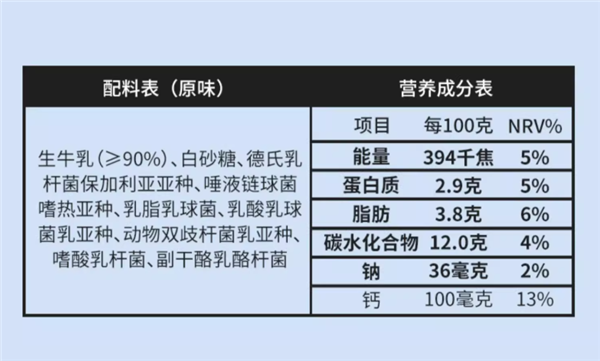 含有2.9g蛋白质,配料只有生牛乳+白砂糖+乳酸菌。