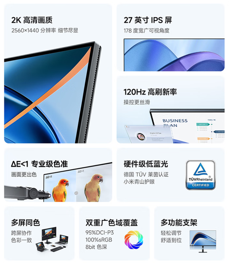 这款27英寸显示器采用纤薄简约设计,三微边结构显著提升屏占比,支持多联屏组建宽广视野。背面配备卡扣式后盖,实现接口隐藏和线材收纳。显示方面搭载IPS面板,拥有2560×1440 QHD分辨率、120Hz刷新率(较前代升级)、300尼特亮度和178°广视角。色彩表现突出,覆盖100% sRGB和95% DCI-P3色域,ΔE<1专业色准,同时通过德国莱茵TÜV低蓝光认证,支持全亮度DC调光与硬件级无频闪技术。