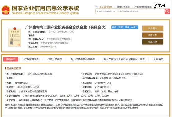 投资界-解码LP获悉,近日,广州生物岛二期产业投资基金合伙企业(有限合伙) 正式成立,总出资额为6.06亿元人民币。该基金由广州高新区投资集团有限公司和广州国聚创业投资有限公司(简称“国聚创投”)共同出资设立,主要经营范围涵盖私募基金、股权投资、投资管理及资产管理等领域。执行事务合伙人为国聚创投。