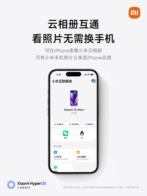 手机上支持云相册功能,用户可以直接在iPhone上通过小米互联服务App查看小米云相册,并可将小米手机照片分享至iPhone应用。