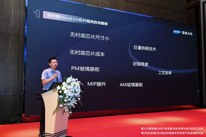 雷曼光电凭借《无衬底 Micro LED 芯片直显研究进展》技术论文,获评本次大会“论文二等奖”,同时于会上发表主题演讲。随着无衬底Micro LED芯片的性价比持续引发行业关注,此次演讲围绕MiP器件封装、PM玻璃基板封装和AM玻璃基板封装三大方向,系统介绍了无衬底Micro LED芯片在直显领域的应用进展。