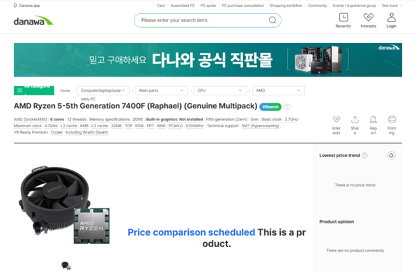 Danawa还显示,锐龙5 7400和7400F目前暂不零售,仅通过OEM或整机提供,价格方面,韩国零售商报价信息显示: