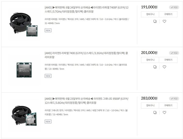 锐龙5 7400F售价为191,000韩元,约合983元人民币;
