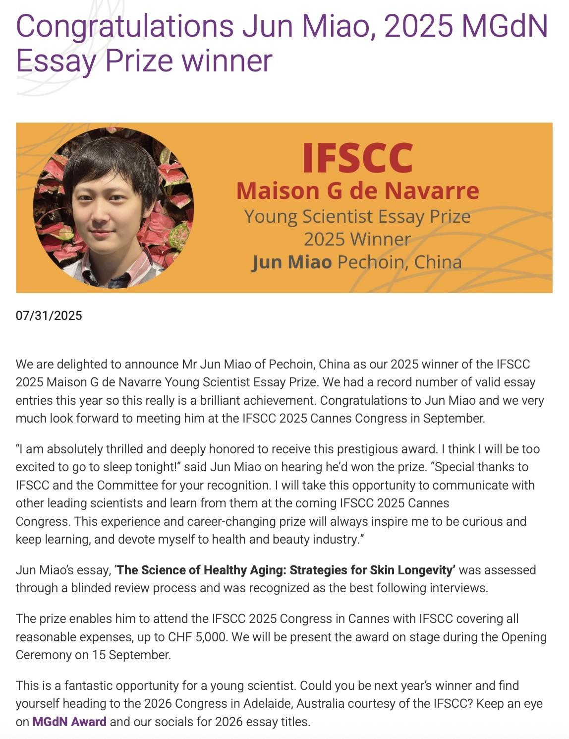 百雀羚苗君荣获2025 IFSCC大会青年科学家奖