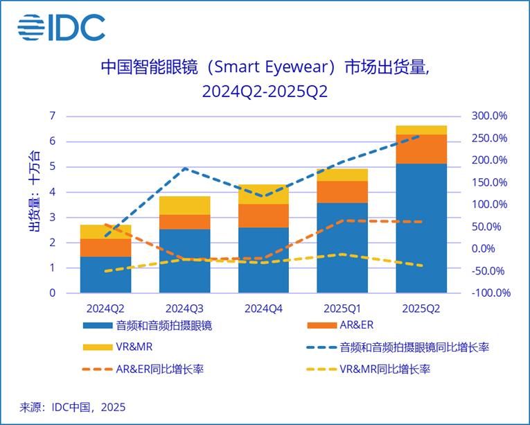 C114讯 9月17日消息(岳明)根据国际数据公司(IDC)最新发布的《全球智能眼镜市场季度跟踪报告》,2025年第二季度中国智能眼镜(Smart Eyewear)市场出货量66.4万台,同比增长145.5%。作为对比,报告期内,全球智能眼镜市场出货量255.5万台,同比增长54.9%。据此数据估算,中国市场出货量占据全球市场四分之一以上。