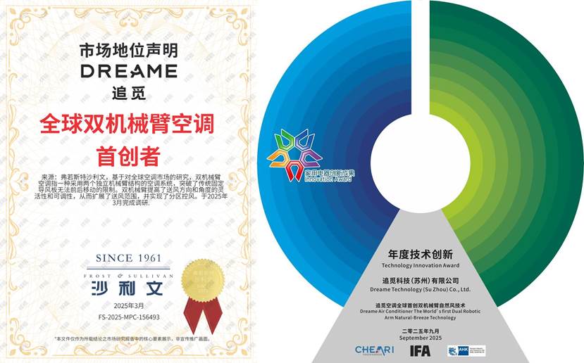 追觅空调创新的“双机械臂驭风技术”凭借其突破性研究,已连续荣获沙利文“全球首创认证”与中国家用电器研究院“年度技术创新成果”两项大奖。