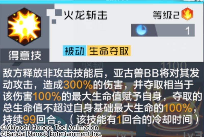 得意技火龙斩击可在敌方使用非攻击技能时触发追击,对目标造成伤害并按比例夺取其最大生命值。