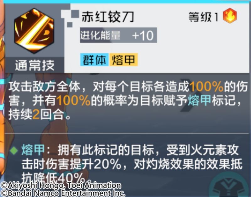 普通技能:赤红铰刀,造成群体伤害,并在攻击后100%概率为目标附加熔甲标记。