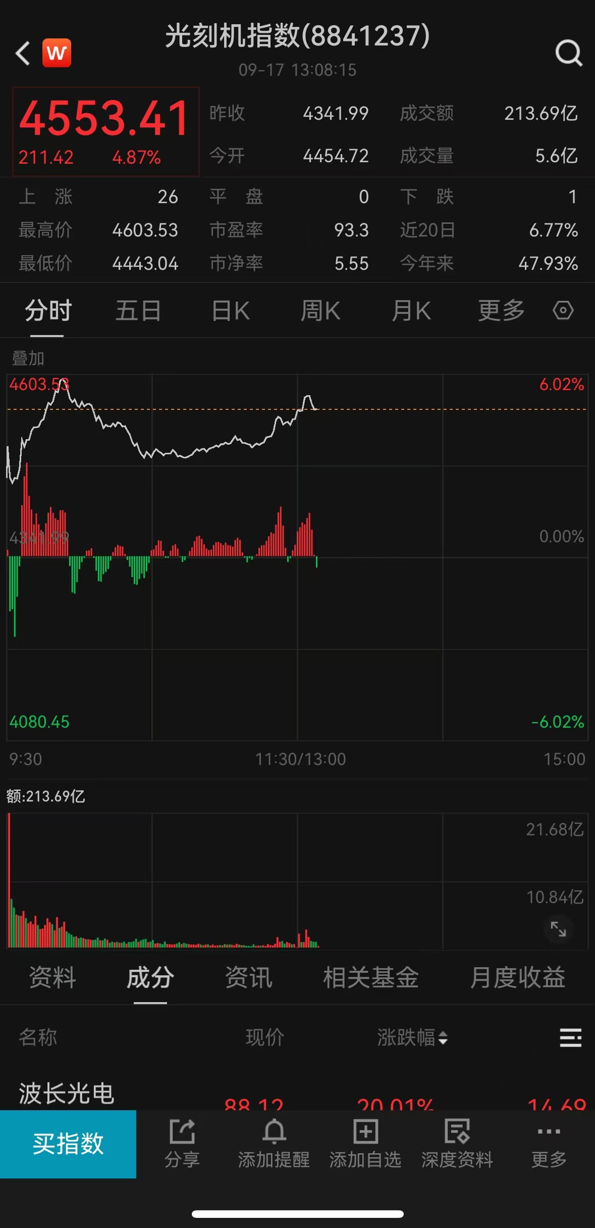 9月17日,wind数据显示,光刻机指数大幅上涨,截至发稿,涨幅达4.87%。其中,波长光电(301421)涨超20%,苏大维格(300331)、奥普光电(002338)、福晶科技(002222)涨超10%。