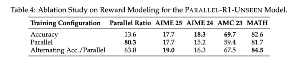 利用阶段(200 步后):切换为纯粹的准确率奖励。此时,模型会逐渐减少对平行格式的依赖,转而专注于提炼和利用在第一阶段发现的最优策略。