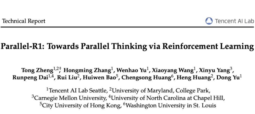 为解决这些难题,来自腾讯 AI Lab 西雅图、马里兰大学、卡内基梅隆大学、北卡教堂山分校、香港城市大学、圣路易斯华盛顿大学等机构的研究者们(第一作者郑童是马里兰大学博士生,本工作于其在腾讯 AI Lab 西雅图实习期间完成)首创了 Parallel-R1 框架 —— 这是第一个通过强化学习(RL)在通用数学推理任务上教会大模型进行并行思维的框架。该框架通过创新的「渐进式课程」与「交替式奖励」设计,成功解决了 RL 训练中的冷启动和奖励设计难题。