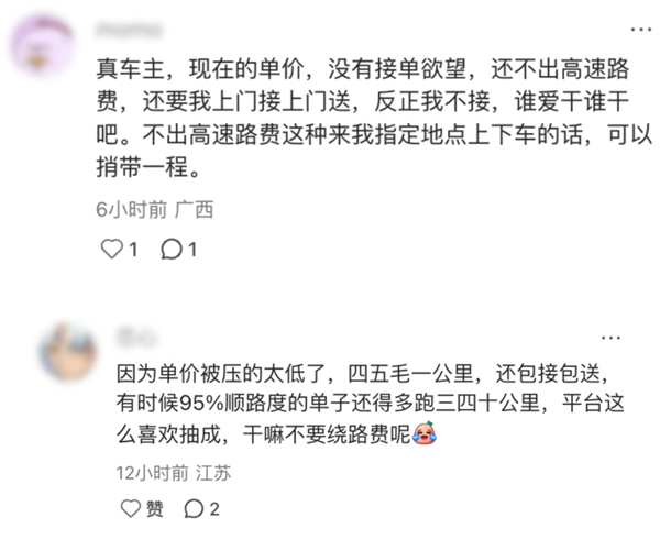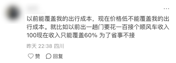 比如有网友觉得现在他赚到的钱,只能覆盖到自己出行的 60%,那他就已经不想接了。