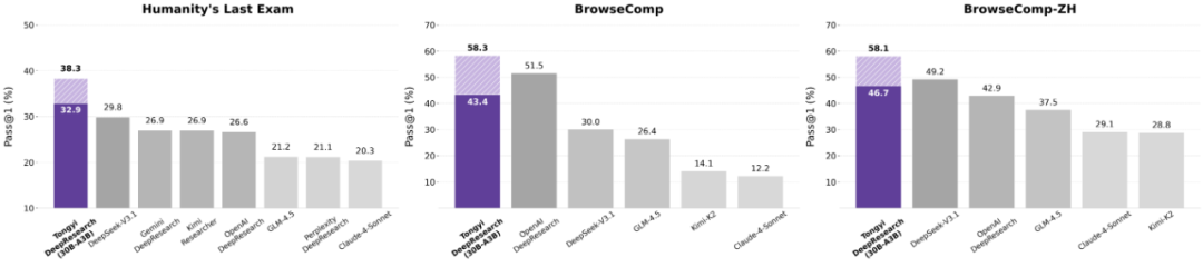 通过这些措施,通义 DeepResearch 团队实现了智能体强化训练的 “闭环”。从基座模型开始,团队进行了 Agentic 持续预训练以初始化工具使用技能,然后使用类似专家的数据进行监督微调以实现冷启动,最后进在 on-policy 的强化学习,使模型进行自我进化。这种全栈方法为训练能够在动态环境中稳健地解决复杂任务的 AI 代理提供了一种全新的范例。