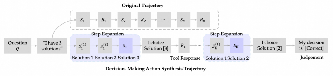 动作合成 基于多风格问题和历史轨迹数据,团队分别构建了三种类型的动作数据,包含规划、推理和决策动作。该方法能够在离线环境下大规模、全面地探索潜在的推理 - 动作空间,从而消除了对额外商业工具 API 调用的需求。特别地,对于决策动作合成,该研究将轨迹重构为多步骤决策过程,以增强模型的决策能力。
