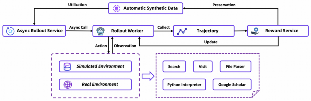 稳定高效的工具沙盒:为了确保在智能体训练和评估期间对工具的稳定调用,团队开发了一个统一的沙盒。该沙盒通过缓存结果、重试失败的调用以及饱和式响应等改进来高效地处理并发和故障。这为智能体提供了快速且鲁棒的交互环境,可以有效防止工具的错误响应破坏其学习轨迹。