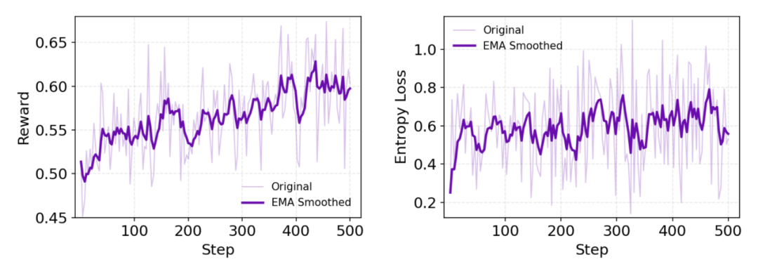 训练过程的动态指标显示,模型学习效果显著,奖励(reward)呈持续上升趋势。同时,策略熵(policy entropy)始终维持在较高水平,这表明模型在持续进行探索,有效防止了过早收敛。团队人员将此归因于 Web 环境天然的非平稳性,该特性促进了稳健自适应策略的形成,也因此无需再进行显式的熵正则化。