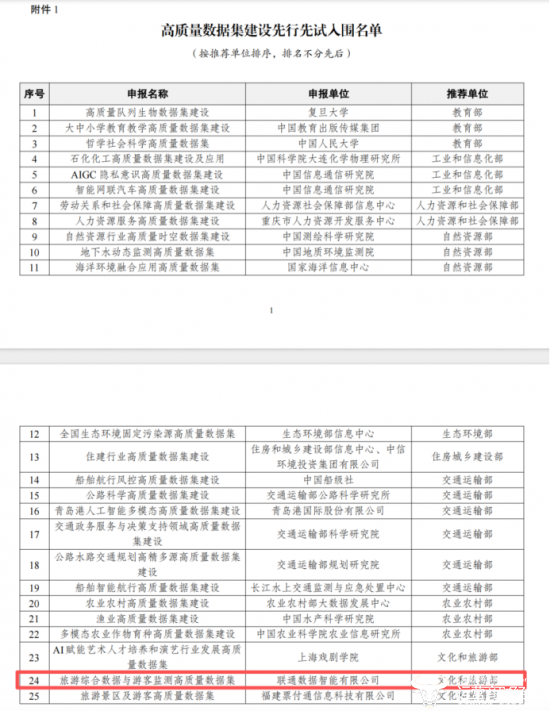 2025 年 9 月 15 日,国家数据局正式公布高质量数据集建设先行先试入围名单。经文化和旅游部推荐,联通数智“旅游综合数据与游客监测高质量数据集”成功入选国家级行业高质量数据集建设先行先试建设单位。