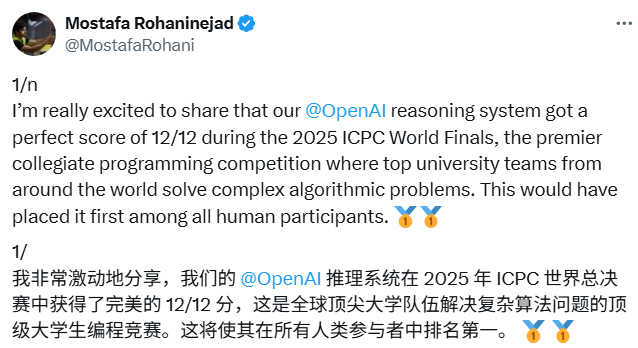 IMO 之后,OpenAI 与 Gemini 双双加冕 ICPC 2025 金牌。